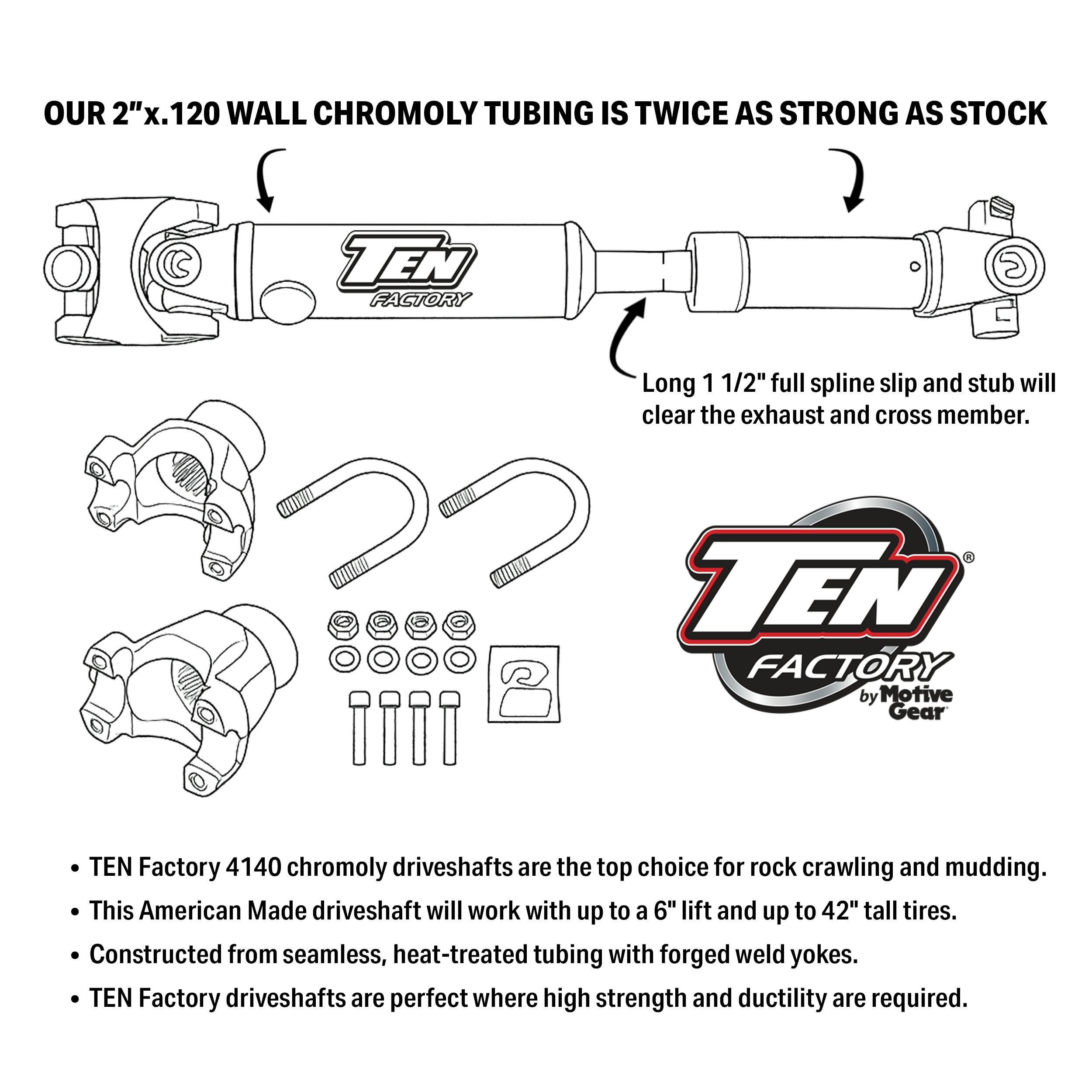 TEN Factory - Precision Forged for Quality, Strength and Performance. All TEN Factory axles feature a 10-year replacement warranty! Front axles and two axle rear kits are black oxide coated. TEN Factory is the brand you can trust for the highest-quality engineered axle shafts and replacement kits. Built with the toughest materials, the wear-resistance of forged steel is heat-treated to produce durable axle shafts for your Jeep, car or truck. Buy with confidence knowing that the latest technologies in metallurgy, heat treating and CNC machining have produced an axle you can count on in the most difficult conditions.
